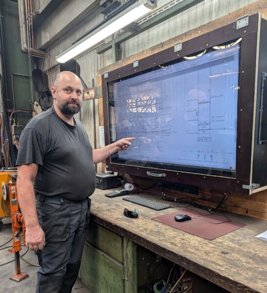 Noch arbeitet er zweigleisig: Jürgen Schmid hat eine Konstruktionszeichnung auf dem gewohnten großen A0-Papier neben sich liegen. Er sieht sie aber auch auf dem Monitor vor sich – einem 55-Zoll-Flachbildschirm, der vor Schmutz und Staub noch mit einer Glasscheibe geschützt ist. Unser Konstruktionsmechaniker ist der erste bei Stahlbau Süssen, dem wir einen digitalen Schlosserarbeitsplatz eingerichtet haben. In Bälde wird das Papier verschwinden und der 43-Jährige, der seit 15 Jahren für uns tätig ist, nur noch mit den Angaben auf dem Monitor arbeiten. Er hat mit der Technik keine Berührungsängste. Im Gegenteil: „Ich sehe klare Vorteile, weil ich zum Beispiel den Plan beziehungsweise Teile davon nach Belieben vergrößern und so die Zahlen besser lesen kann“, sagt Jürgen Schmid. Ob Dachtragwerke oder Hallenkonstruktionen – Konstruktionspläne für alle Arten von Kundenprojekten erhält Jürgen Schmid von nun an digital.