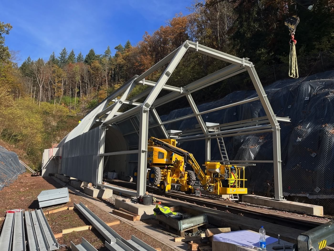 Die Umsetzung ist logistisch anspruchsvoll: Die Anlieferung erfolgt ausschließlich über Gleisgeräte von einer Baustelleneinrichtungsfläche aus. Parallel dazu laufen die Montagearbeiten an zwei weiteren Tunneln.