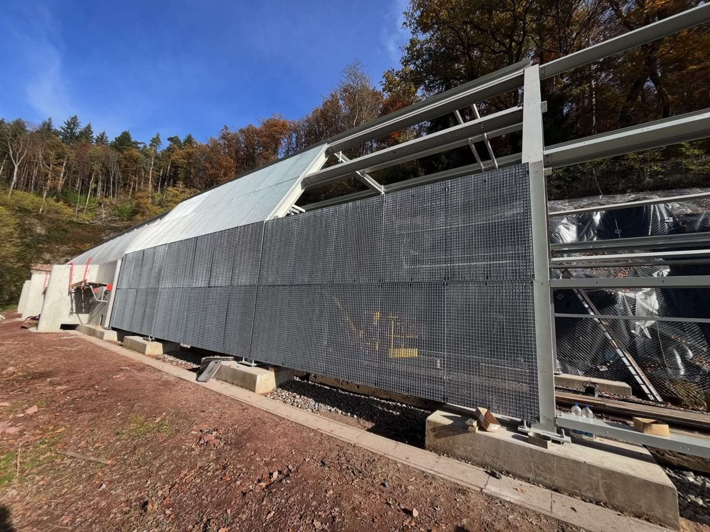Für die Konstruktion kommt ein Stahltragwerk mit Laufstegen zum Einsatz – rund 60 Tonnen Stahl pro Tunneleingang, ausgestattet mit einer Duplexbeschichtung für hohe Beständigkeit. Zusätzlich werden pro Eingang etwa 500 m² Wandgitterroste, die speziell für dieses Bauvorhaben entwickelt wurden, montiert.